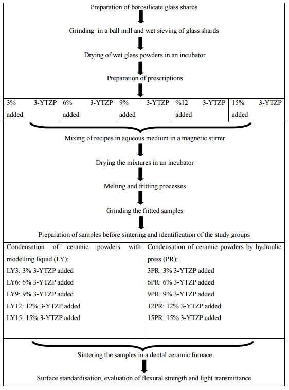 The materials used in the study are listed in Table 1. The flow chart of the research is shown in Table 2. This experimental study used a hammer to break commercially available borosilicate glasses into small pieces. During the breaking process, the hammer was wrapped in a thick towel to prevent the metal powders in the hammer from contaminating the glass fragments. The borosilicate glass shards that had been reduced to small pieces were added to the ball mill container, taking into account the volume of the ball mill container, and ground with alumina balls for 30 minutes. The glass powders removed from the mill were wet-sieved through 100-micron sieves. The glass powders remaining on the sieve were dried in an oven at 100 °C for 24 hours, ground in a ball mill for 30 minutes, and dried with the same protocol. Five different recipes were prepared by adding 3% (3), 6% (6), 9% (9), 12% (12) and 15%(15) w/w zirconia powder to the dried glass powders by weighing on a precision balance. In the recipe preparation process, after adding zirconium to the glass powders in the specified proportions, they were mixed in an aqueous medium with a magnetic stirrer for 30 minutes, and the mixed samples were dried in an oven at 100 °C for 24 hours. The dried samples were melted between 1450-1500°C, and the melted samples were subjected to a fritting process. After fritting, the samples were again crushed using a towel-wrapped hammer and ground in a ball mill for 30 minutes. All recipe groups were then divided into two sub-groups (condensed by layering (LY3, LY6, LY9, LY12, LY15) or pressing (PR3, PR6, PR9, PR12, PR15) methods), with the glass powders in the LY group mixed with dental modelling liquid. To ensure standardisation of the samples belonging to this group, the amounts of powder and modelling liquid were prepared in the same ratio in all recipe groups using a scaled spoon and dropper (2 scales of powder, ten drops of liquid). The powders in the PR group were pressurised to 100 bar in a hydraulic press in the dry state. All samples were sintered at 925°C in a dental ceramic furnace in standard moulds with a diameter of 14x4x2 mm for flexural strength and 10 mm and 2 mm thickness for light transmission. To standardise the surfaces of all specimens after sintering, the specimens to be evaluated for flexural strength were ground with #400, #600 and #800 silicon carbide papers and the specimens to be evaluated for light transmittance were ground with #400, #600, #800, #1000, #1200 and #1500 silicon carbide papers.