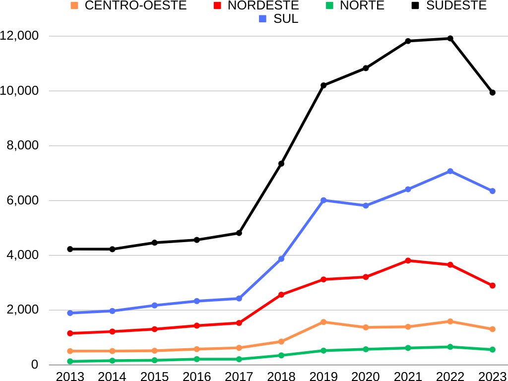 Gráfico 1. Incidência de Diagnóstico Totais Por Residência de Neoplasia Maligna de Cólon por Região no Brasil (2013-2023). Gráfico confeccionado pelos próprios autores com os dados do DATASUS.