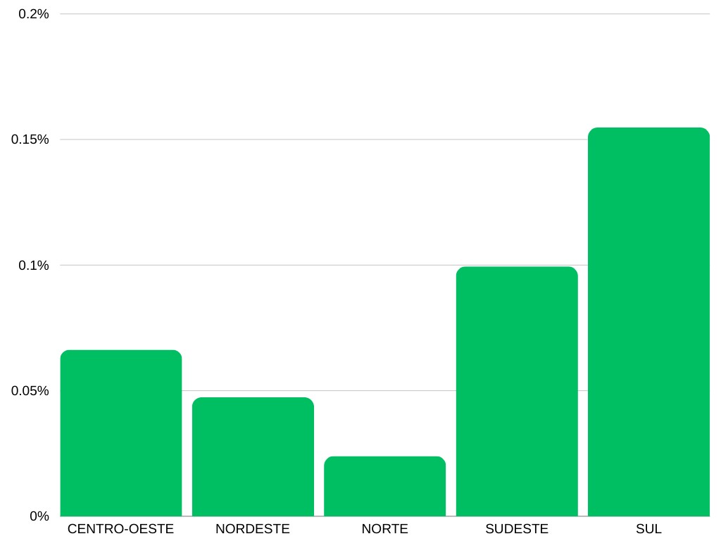 Ao analisarmos as taxas de neoplasia maligna de cólon em relação à população, observamos que a Região Centro-Oeste apresenta uma incidência de 0.066313%, enquanto o Nordeste registra 0.047383%. A Região Norte exibe uma taxa mais baixa, correspondendo a 0.023920%, contrastando com o Sudeste, que possui uma incidência de 0.099426%. Por sua vez, a Região Sul destaca-se com a maior taxa, atingindo 0.154741% (Gráfico 2-3).