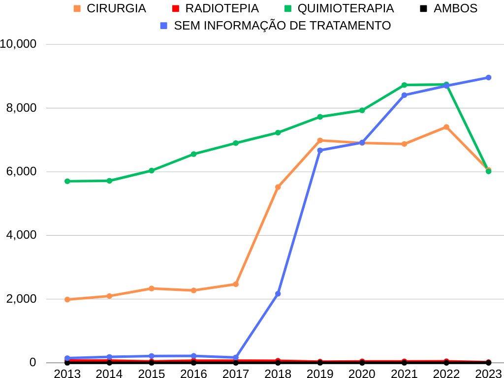 Em termos de tratamentos, a quimioterapia é a principal medida, seguida pela cirurgia, enquanto a radioterapia é utilizada em menor escala. A limitação de dados sobre tratamentos, a partir de 2017, reforça a necessidade de uma melhora nos registros para uma avaliação mais acertada e a orientação de práticas futuras.