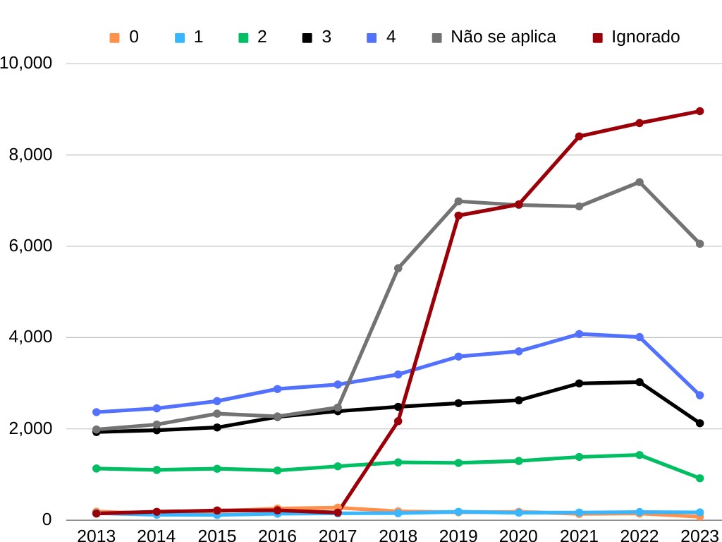 A quantidade de casos sem informações de tratamento aumentou ao longo dos anos, com um aumento acentuada entre 2017, 2018 e 2019, estabilizando-se em torno de 8.000 casos a partir de 2020.