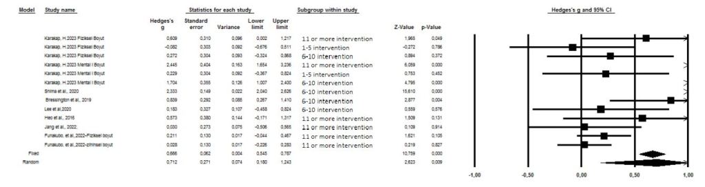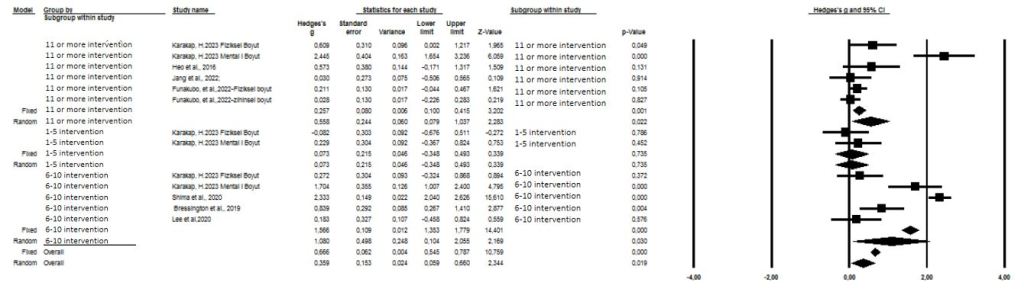 It was found that laughter therapy with 1-5 interventions was effective in increasing the quality of life, but it was not statistically significant. (g=0.073; Z=0.339; p=0.735>0.05). According to 6-10 intervention and 11 or more intervention measurements, laughter therapy was found to be effective in increasing quality of life and was statistically significant (respectively g=1.080; Z=2.169; p=0.030<0.05 and g=0.558; Z= 2.280; p=0.022<0.05). In the combined results of the study, it was found that the mean quality of life score in the experimental group that received laughter therapy was statistically significantly higher than the control group. (g=0.359; Z=2.344, p=0.019<0.05) (Figure 13).