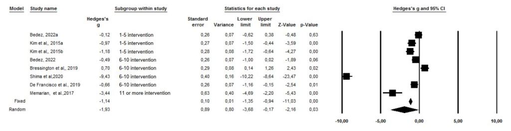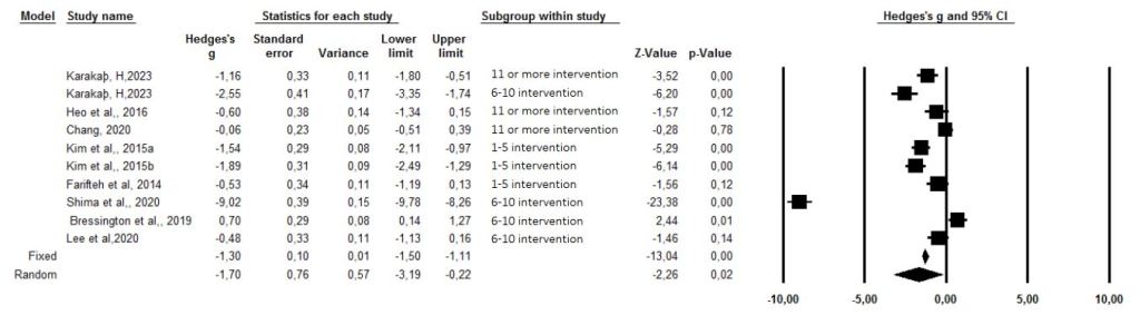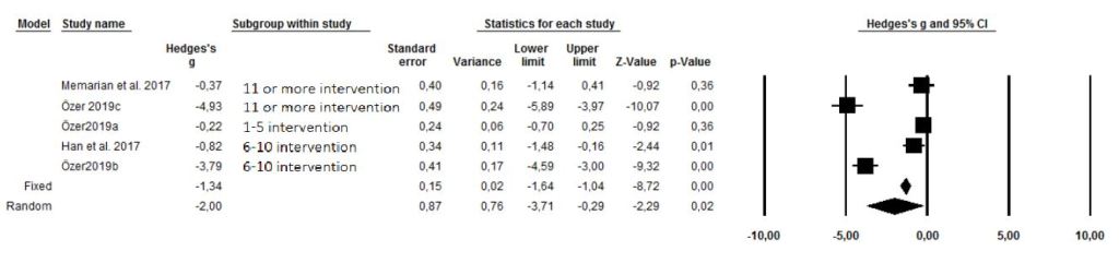According to the combined results of the findings of the eight included studies; laughter therapy with 1-5 interventions was effective in reducing stress and was statistically significant (g= -1.33; Z=-3.40; p=0.00<0.05); according to 6-10 intervention and 11 or more intervention measurements, laughter therapy was found to be effective in reducing stress but it was not statistically significant (respectively g= -2.88; Z=-1.34; p=0.18>0.05 and g= -0.58; Z=-2.64; p=0.10>0.05). In total, it was found that the stress level score in the experimental group that received laughter therapy was statistically significantly lower than the control group. (g= -0.94; Z=-3.64, p=0.00<0.05) (Figure 10).