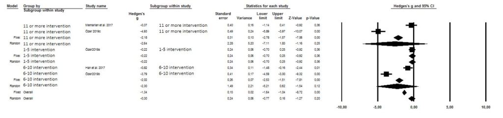 In this meta-analysis, subgroup analysis was conducted to explain the reason for heterogeneity. In subgroup analysis; since the number of interventions was different in the included studies, repetitive measurements after the intervention were grouped and evaluated. When the combined results of the studies according to the repetitive laughter therapy interventions were examined, 1-5 interventions (g= -0.22, Z=-0.92, p=0.36>0.05), 6-10 interventions (g= -2.30, Z=-1.54, p=0.12>0.05) and 11 or more interventions (g= -2.64, Z= -1.16, p=0.25>0.05) it was found that the sleep quality scores of the experimenatal groups were higher than the control groups, however these differences were not statistically significant. (Figure 4). It was observed that the total sleep quality scores of the experimental group increased after all interventions compared to the control group (g= -0.30, Z= -1.27, p=0.20>0.05). According to the effect sizes, it was determined that 11 or more interventions was the most effective number of intervention on sleep quality. (g= -2.64). Measurement results after 6-10 and 1-5 interventions, respectively, were also found to be effective (g= -2.30; g= -0.22). As a result of the analysis, it was seen that the number of laughter therapy interventions was effective on sleep quality, but the difference between the groups was not statistically significant (p>0.05).