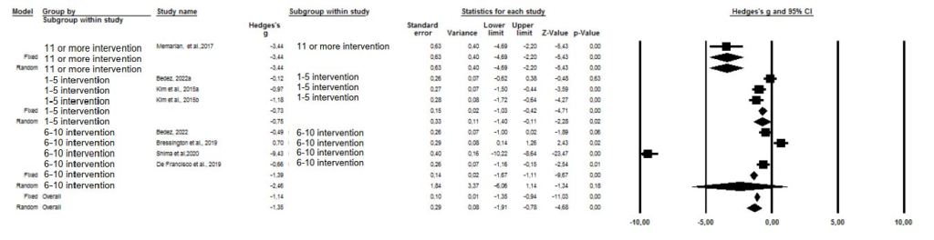 In the effect of laughter therapy on anxiety, 11 or more interventions were found to be the most effective number of applications (g= -3.44 p=0.00<0.05), followed by 6-10 interventions and 1-5 interventions, respectively. (g= -2.46 p=0.18>0.05; g= -0.75 p=0.02<0.05). Laughter therapy with 6-10 interventions was found to be effective, but not statistically significant. (p=0.18>0.05). According to the combined results of the studies, it has been determined that the laughter therapy reduces the anxiety levels of patients. (g= -1.35, Z=-4.68, p=0.00<0.05) (Figure 7.) In the included studies, according to the subgroup analysis of the number of laughter therapy interventions, the difference between the groups was found to be statistically significant (p=0.001<0.05).