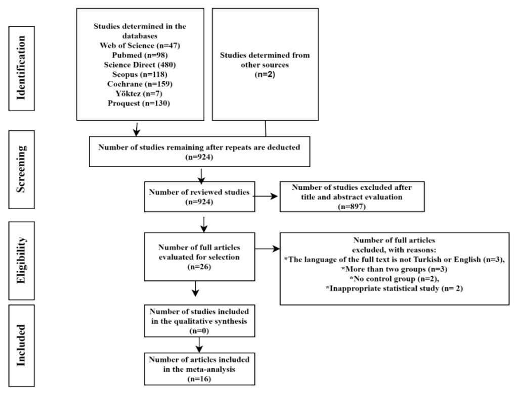 In this study, the results of the scan yielded 1039 records from the databases; Web of Science (n=47), Pubmed (n=98), Science Direct (n=480), Scopus (n=118), Cochrane (n=159), YÖK-National Thesis Center (n=7) and Proquest (n=130) and 2 from other sources (n=2), a total of 1041 studies were obtained. After the repetitive data extraction, title and summary analysis, 26 studies were identified. As a result of full-text analyzes and inclusion/exclusion criteria, 16 studies were included in the meta-analysis. Reasons for exclusion from meta-analysis; PRISMA flowchart indicated that full-text language was within the exclusion criteria (n=3), no control group (n=2), more than two groups (n=3), and inappropriate statistical studies (n=2). (Figure 1).