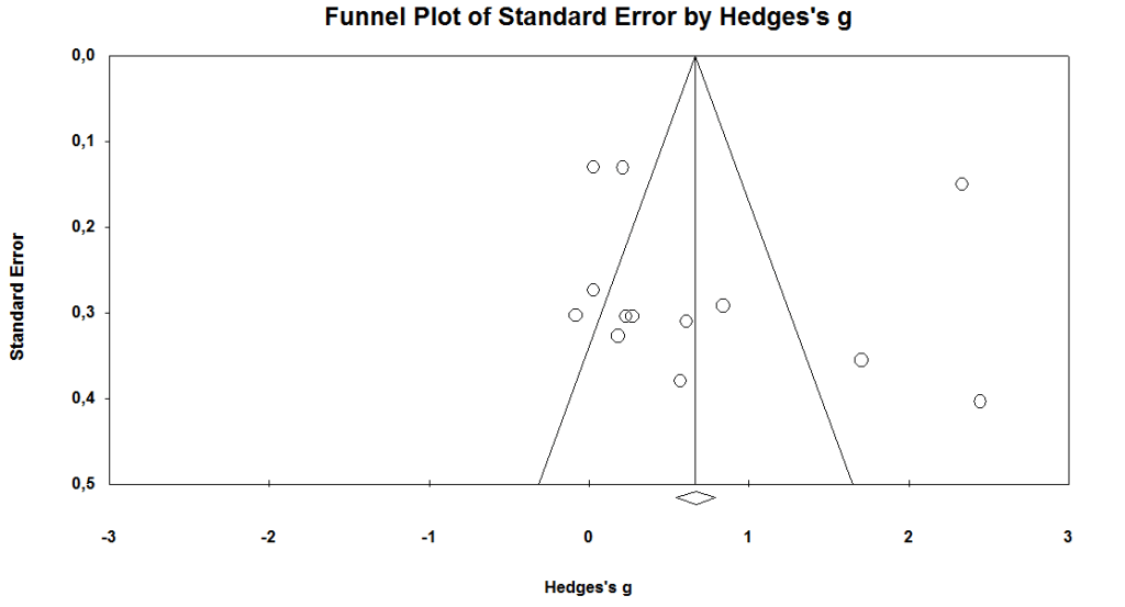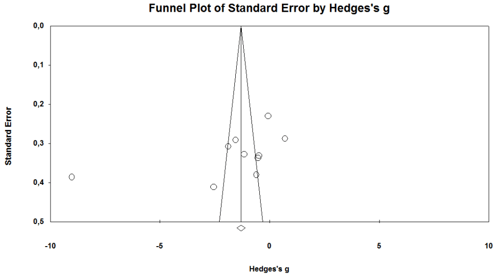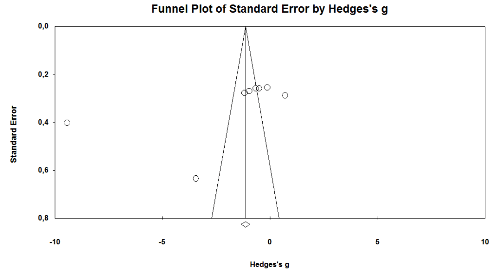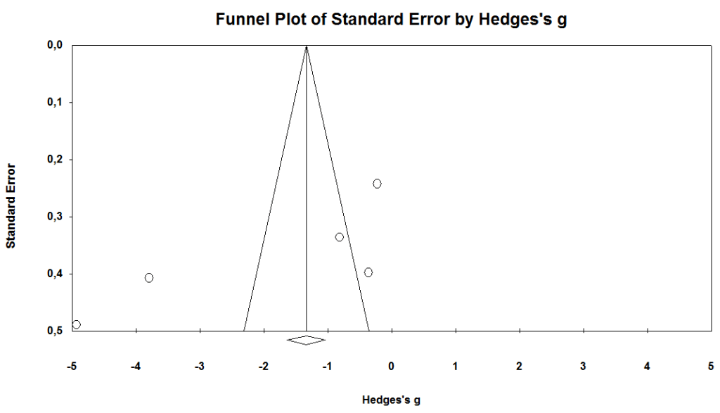 It was determined that studies were highly heterogeneous and the randomized effects model was used (Q=505,742, I2=98,616). The combined results of six studies (18,30,31,33,37,38) were examined according to the Hedge’s g effect size and the effect size was determined as g= -1.93 (95% CI=-3.768;-0.174, p=0.03<0.05).