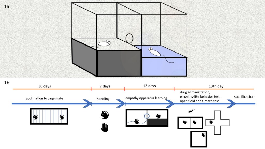 For 30 days before the experiments, the rats were housed in the same cage with randomly selected pairs to get accustomed to one another. The rats were subjected to handling and then placed in the empathy apparatus for 7 days (5 minute) to enable them to adapt to the experimental environment. Following the adaptation period, for a duration of 12 days, all the rats were placed in the empathy apparatus for them to learn to rescue their cage mate.