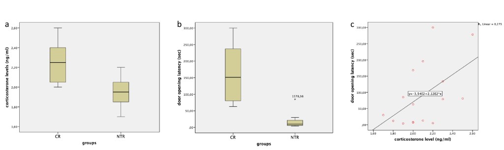 Serum corticosterone levels were significantly different between two groups (t(14)=3,11, p=0.008). Compared to the CR group (2,25 ± 0,22 ng/ml), corticosterone levels were significantly decreased in the NTR group (1,95 ± 0,16 ng/ml) (Figure 2a). The door opening times were significantly different among the two groups (t(8,2)=4,2, p=0.003). When NTX-treated and non-NTX treated groups were compared, door opening latency in the NTR group (20,50±27,33 sec) were significantly decreased compared to door opening latency in the CR group (162,37±90,81 sec) (Figure 2b). The corticosterone levels were found to be moderately correlated with the door opening durations (r=0,525, p=0.03) (Figure 2c).