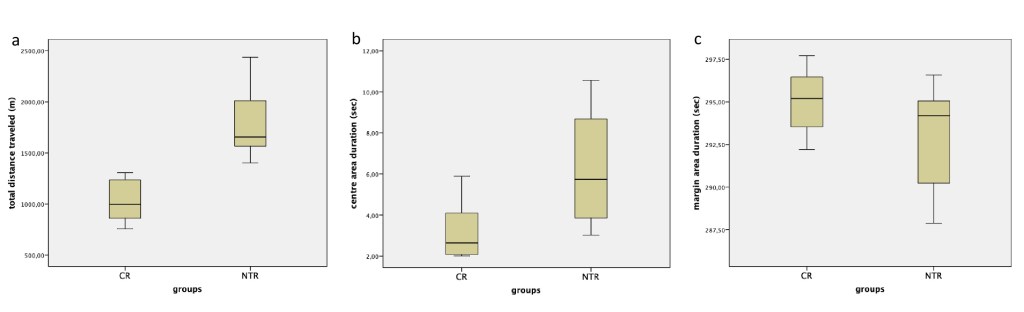The open field test demonstrated a significant difference between the groups in terms of total distance traveled (t(14)=-5,35, p<0.0001). The total distance traveled measurements of the NTR group (1787 ± 340 cm) was significantly longer than CR group (1031 ± 209 cm) (Figure 3a). The spent time in the margin area showed no significant difference and in the centre area displayed significant difference between the groups (t(14)= -2,77, p=0,015) (Figure 3b, 3c) . In the centre area, spent time in the NTR group (6,26±2,79) was longer than in the CR group (3,19±1,39).