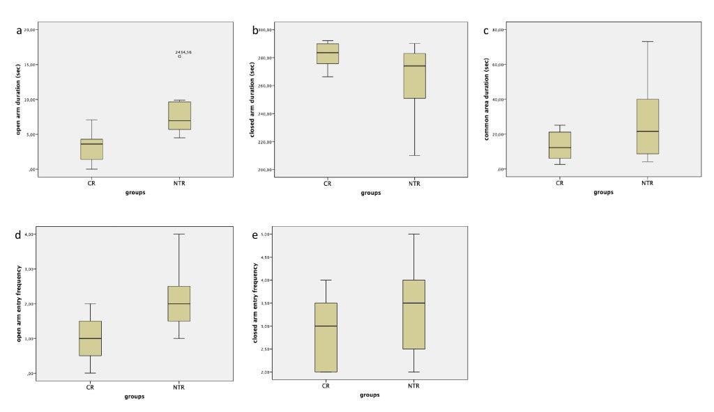 In the elevated plus maze test, spent time in the common area and closed arm showed no significant difference between the groups. The spent time in the open arm showed significant difference among the groups (t(14)= -3,14, p=0,007)(Figure 4 a-c). In the NTR group (8,15±3,76 sec), time spent in the open arm was long than in the CR group (3,21±2,35 sec). The entry frequency into open arms showed significant difference (t(14)= -2,55, p=0.023) and closed arms no significant difference among the groups. In the CR group, the frequency of entry unto the open arms (1,00±0,75) was less than in the NTR group (2,12±0,99) (Figure 4d, 4e).