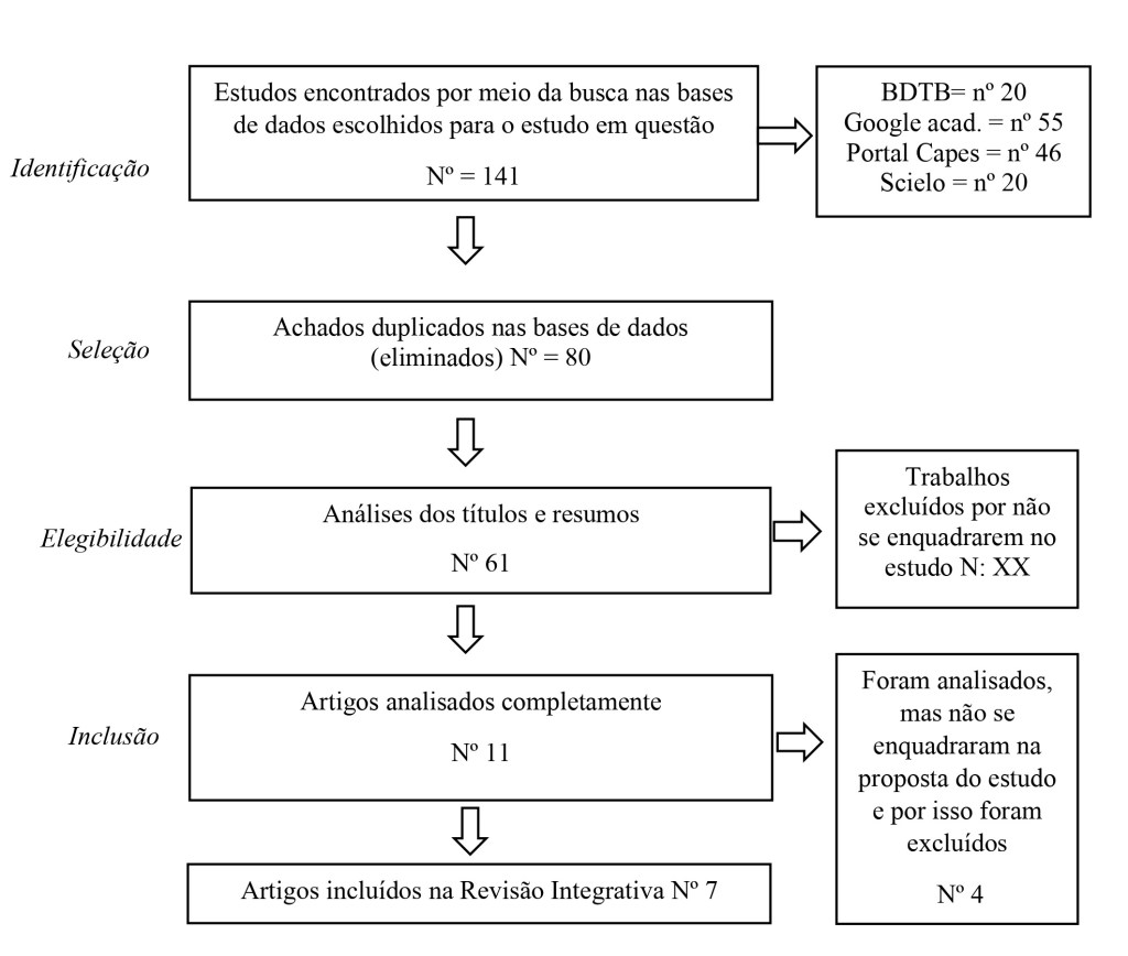 Uma vez identificados os artigos relevantes iniciamos o processo de seleção (triagem). Em seguida, conduzimos uma revisão completa dos títulos e resumos, exceto aqueles que não atendem aos objetivos do estudo. Em seguida, efetuamos uma análise minuciosa dos trabalhos selecionados, denominada “inclusão”, excluindo trabalhos que não atendem aos objetivos. Assim, com base na figura 1, chegamos aos artigos anexados à elaboração do estudo.